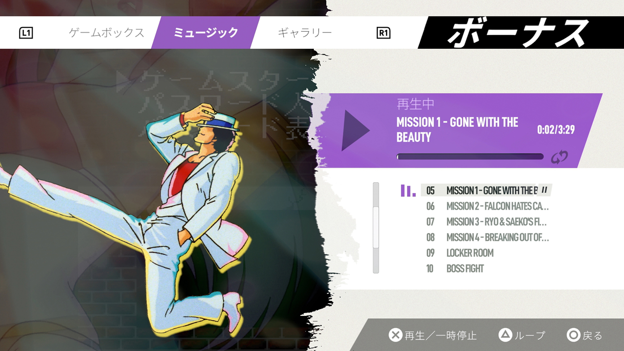 このゲーム、地味に BGM が良い(特に 1・4 ステージ目の曲がカッコ良い)んだけど、今回、本編が「強化版」「ハード」「オリジナル」の 3 種類用意されていて、ゲーム中の BGM はかなり大きめの音で聴けるようになっている。当時の PC エンジン版だと BGM の音量が小さめで、その小さいほうの音が「ミュージックプレーヤー」で聴ける感じ。